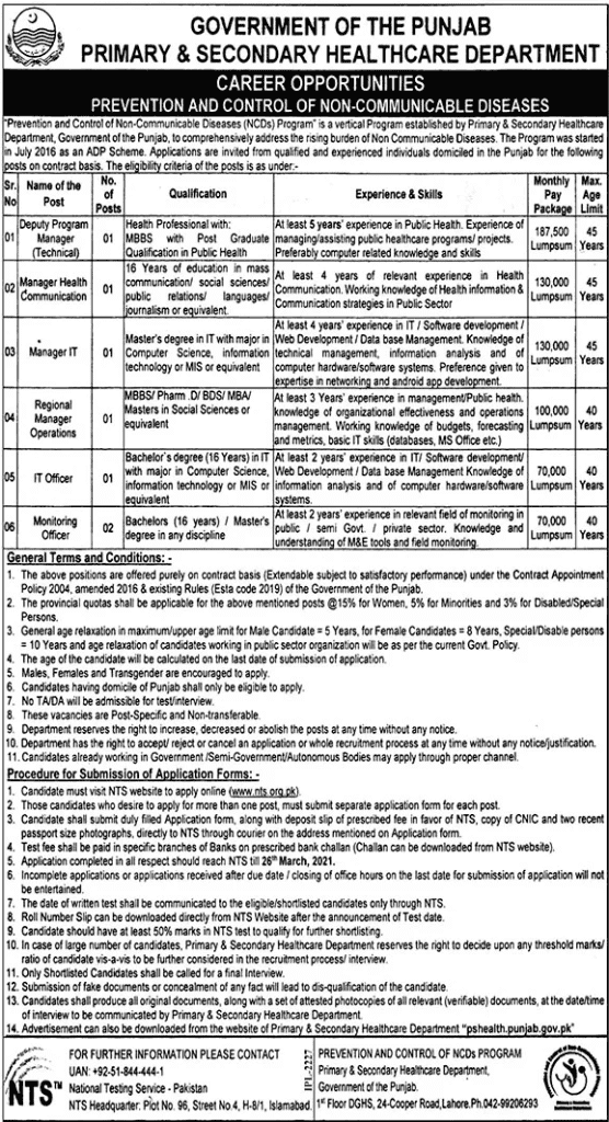 Govt job of Department of Primary and Secondary Health Care 2021 through NTS has been declared through the applications and advertising from right candidates are welcomed on the recommended application.