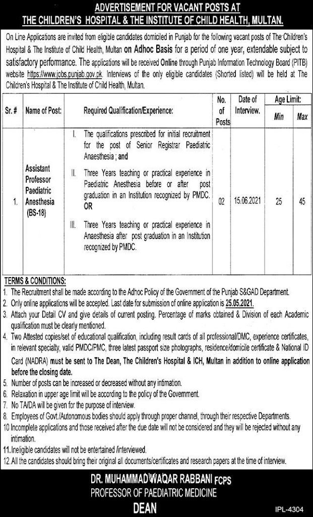 Online Applications are invited from eligible candidates domiciled in Punjab for the following vacant posts of The Children’s Hospital & The Institute of Child Health, Mullen on Adhoc Basis for a period of one year, extendable subject to satisfactory performance. The applications will be received Online through Punjab Information Technology Board (PITS) website https://www.jobs.punjab.gov.pk. Interviews of the only eligible candidates (Shorted listed) will be held at The Children’s Hospital & The Institute of Child Health, Mullen.