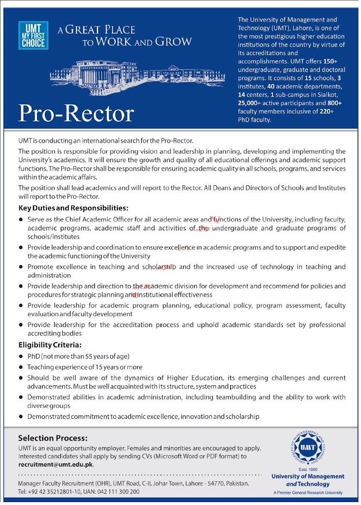 - Interested candidates shall apply by sending CVs (Microsoft Word or PDF format) to recruitment@umt.edu.pk.
